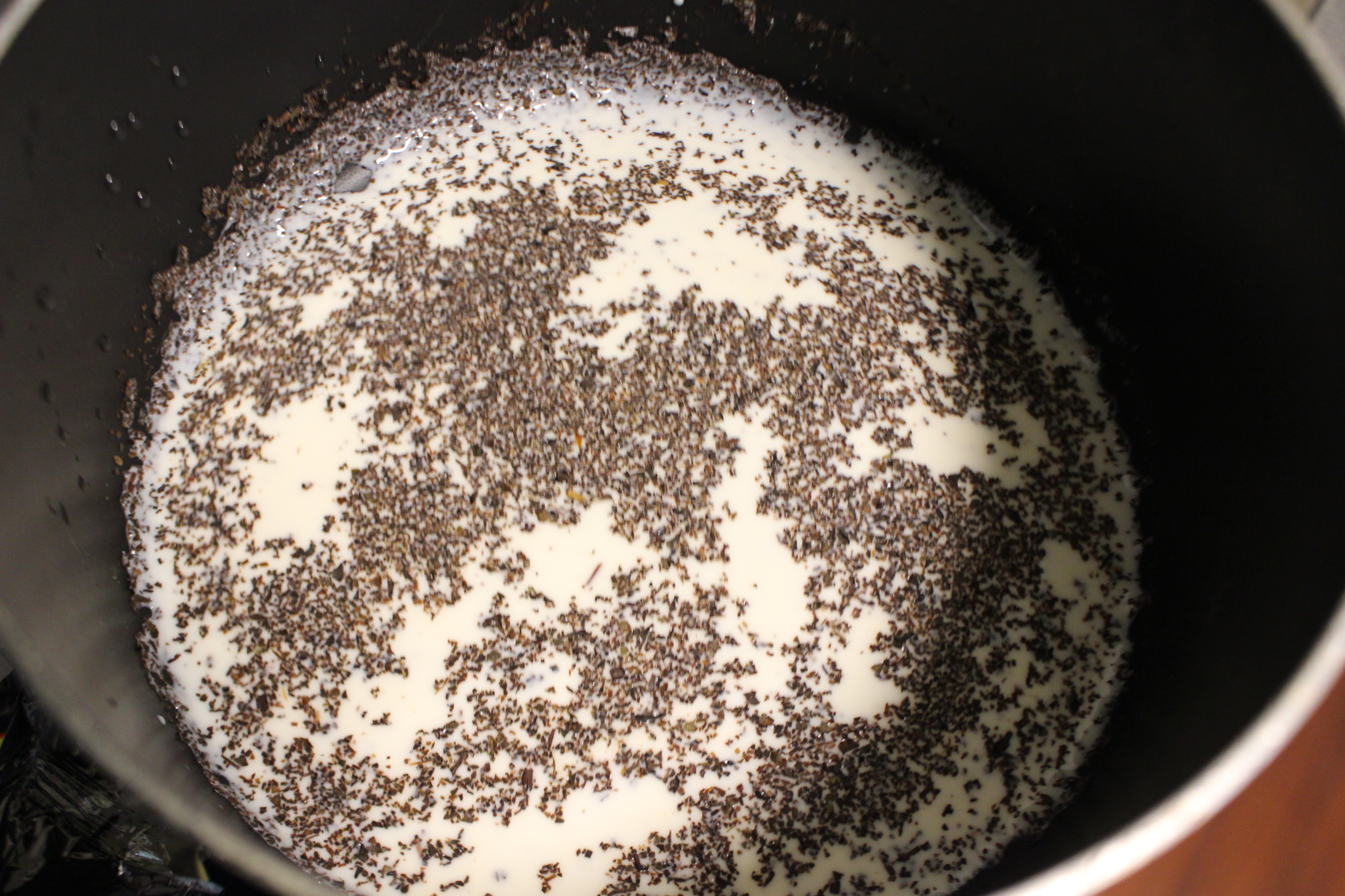 Boil the Heavy cream and milk with Earl gray tea until it changed the color into Earl gray.